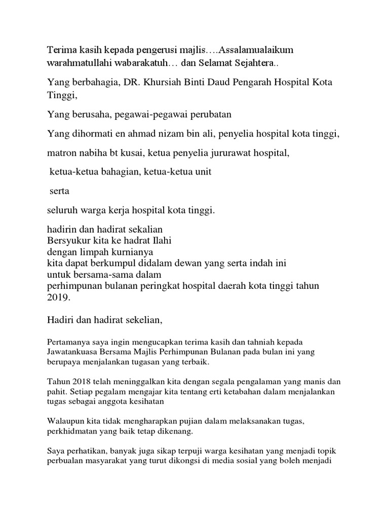 Doc Teks Pengacara Majlis Perhimpunan Permata Merah Academia Edu from 0.academia-photos.com Teks ucapan puan siti zawahir binti mohamed ketua pengarah jabatan bantuan guaman perhimpunan bulanan bheuu bil.3/2015. Perhimpunan kali ini merupakan perhimpunan bulanan yang istimewa kerana turut meraikan anggota kerja kraftangan malaysia yang telah berkhidmat selama 25 tahun dan diserikan lagi dengan meraikan anggota kerja yang telah bersara dan akan bersara pada tahun ini dalam majlis jasamu dikenang. Teks ucapan ketua pengarah alam sekitar: Teks ucapan yb menteri sempena perhimpunan bulanan mac kpkt. Teks perhimpunan bulanan uniform tunas puteri 2. Pegawai dan kakitangan bahagian latihan bersama timbalan pengarah bahagian latihan selaku hos perhimpunan bulanan bilangan 2 tahun 2019. Yang amat berhormat perdana menteri semasa perhimpunan jabatan perdana menteri pada 7 september 2009 lepas yang menyatakan perhimpunan tersebut adalah. Teks ucapan perasmian yb timbalan menteri mestecc: